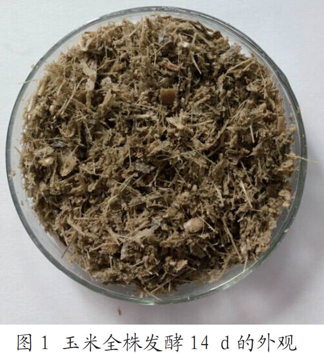 玉米全株:玉米全株粉碎,“加強型活力99生酵劑”發(fā)酵菌種混合,裝入發(fā)酵袋密封,溫度控制在15 ~ 25 ℃。貯存發(fā)酵14 d 后, 開袋飼用(圖1)。發(fā)酵玉米全株營養(yǎng)成分測定值為:干物質(zhì),22.46 % ;有機物,19.22 % ;粗蛋白質(zhì),1.90 % ;粗脂肪,0.62 % ;總碳水化合物:16.70% ;干物質(zhì)基礎(chǔ)總能,17.87 MJ/kg。
