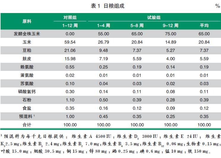 采用單因子試驗設(shè)計,選取體重相近(45.34±0.56)kg 的生長豬(杜×長× 大)12 頭,隨機分為2 個處理。對照組, 飼喂基礎(chǔ)日糧, 參考NRC(1998)生長育肥豬營養(yǎng)需要供給;試驗組,分別在試驗的14 周、58 周和912 周,用55%、65% 和75% 發(fā)酵玉米全株等量替換基礎(chǔ)組日糧。詳細日糧組成和營養(yǎng)水平見表1、表2。