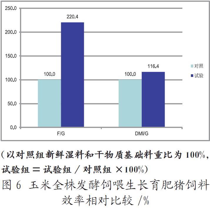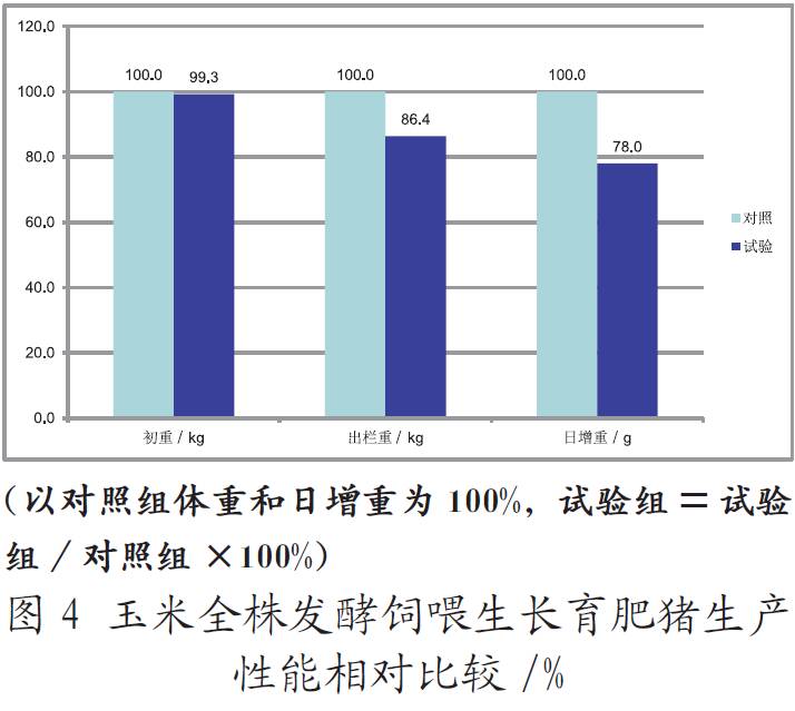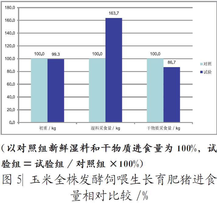 2)玉米全株發(fā)酵后,按55% ~ 75%比例替代生長育肥豬日糧,濕料基礎(chǔ)采食量增加,干物質(zhì)采食量減少,增長速度有所減慢,出欄體重有所減少。
