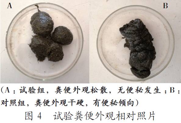 日糧中添加發(fā)酵全株玉米后,含水量較高,質(zhì)地柔軟,較松散,具有酸香味(圖2)。生長育肥豬飼喂發(fā)酵全株玉米日糧減少了皮屑,改善豬的膚色,提高亮度,毛質(zhì)較長、硬,試驗組豬只整體略顯體長背窄,對照組外觀略顯體短背寬(圖3)。觀察豬的糞便發(fā)現(xiàn),飼喂發(fā)酵全株玉米日糧,豬糞便含水率較高、有光澤,質(zhì)地松軟、無結(jié)塊,沒有了便秘(圖4)。