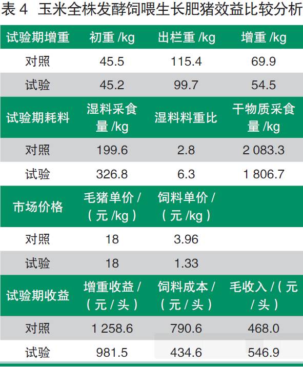 3)飼喂發(fā)酵全株玉米日糧,飼料成本減少的費用能夠超過因生長速度減慢減少的增值,養(yǎng)殖效益增加。