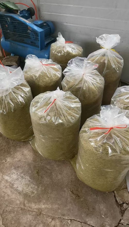 將 99 多功能飼料發(fā)酵劑與100公斤玉米粉、2公斤食鹽混合均勻后撒到1000公斤的粉碎好的甘蔗粉上。再把含水量調(diào)到60%左右。接著就可以進行密封發(fā)酵了,發(fā)酵桶、發(fā)酵袋、發(fā)酵池均可用來做發(fā)酵容器。