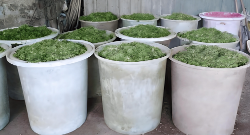 2.含水量調(diào)節(jié)到55%左右,如果含水量太高,可以加入米糠、麥麩或更多玉米粉進(jìn)行調(diào)節(jié),裝入非金屬容器中壓實(shí)和嚴(yán)格密封進(jìn)行厭氧發(fā)酵,低溫季節(jié)可以放置于陽光下或溫室棚中進(jìn)行發(fā)酵,發(fā)酵時(shí)間為7天以上,根據(jù)溫度和濕度的不同,發(fā)酵時(shí)間會有所差異,發(fā)酵完成的甘蔗濾泥由深綠色變成微黃色有酸香味,發(fā)酵完成后密封狀態(tài)下可以保存1年以上不變質(zhì),發(fā)酵完成的標(biāo)志是打開容器能夠聞到濃郁的酸香醇味道,即可將發(fā)酵好的濾泥飼料作為動(dòng)物飼料使用。