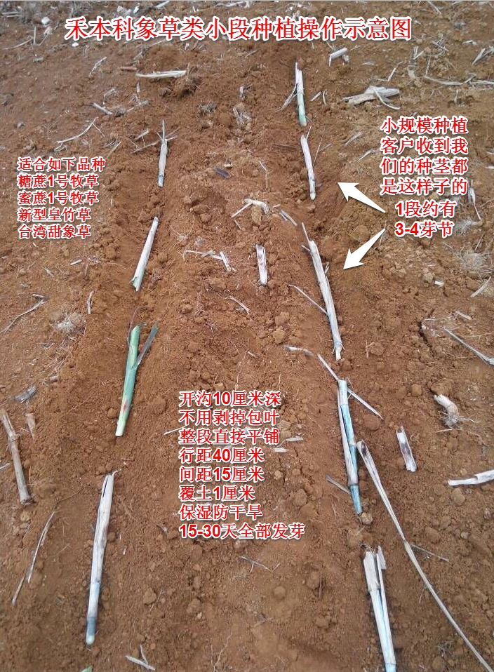 禾本科象草類牧草一般采用種莖繁殖(跟甘蔗一樣),將種莖埋入1厘米的土層下,保持土壤濕潤(rùn),日平均氣溫在22℃以上時(shí),15天左右有50%發(fā)芽,40%左右需要在30天左右才能全部發(fā)芽,10%左右可能由于多種因素不能發(fā)芽。在幾個(gè)牧草品種比較中,新型皇竹草發(fā)芽最快,其次是臺(tái)灣甜象草,糖蔗1號(hào)牧草和蜜蔗1號(hào)牧草發(fā)芽稍慢于前兩者。