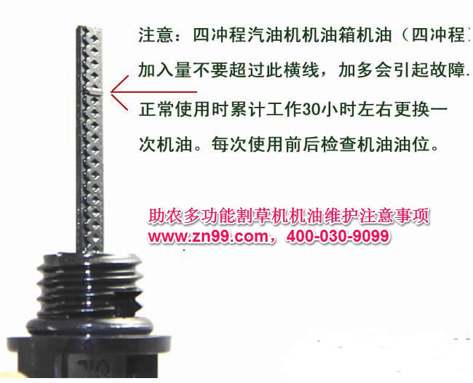 每次使用割草機之前,都要檢查機油油面,看是否處于機油標尺上下刻度之間。新機使用5小時后應更換機油,使用10小時后應再更換一次機油,以后根據(jù)說明書的要求定期更換機油。換機油應在發(fā)動機處于熱機狀態(tài)下進行。加注機油不能過多,否則將會出現(xiàn):黑煙大,動力不足(氣缸積炭過多、火花塞間隙小).發(fā)動機過熱等現(xiàn)象。加注機油也不能過少,否則將會現(xiàn):發(fā)動機齒輪噪音大,活塞環(huán)加速磨損和損壞.甚至現(xiàn)拉瓦等現(xiàn)象,造成發(fā)動機嚴重損壞。
