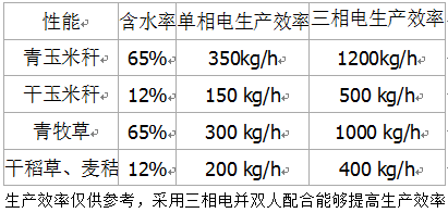 型號分單相電和三相電,單相電使用電機(jī)功率為4.5KW,建議從電表處直接接線確保線徑功率。推薦使用三相電。各種禾本科如新型皇竹草、糖蔗2號牧草等、青玉米秸稈等均可加工。使用單相電切超細(xì)時產(chǎn)約6百公斤,打漿約4百公斤,使用三相電產(chǎn)量更高。2人配合使用能夠提高效率。