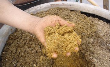 3.將含糖菌水或糖水(指用固體型有益微生物制劑者)均勻噴灑在發(fā)酵料中,邊拌邊灑,使發(fā)酵料的含水量達(dá)到手捏成團(tuán)、落地即散的程度,一般料、水重量比為10.4左右為宜。