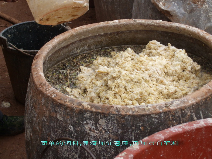 ① 即直接用市場(chǎng)上的全價(jià)飼料,配合少量發(fā)酵豆渣的飼喂方法: