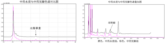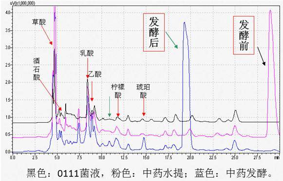 發(fā)酵后部分成分發(fā)生變化,除蘋果酸含量有所降低外,各種有機(jī)酸均有不同程度的升高,其中檸檬酸和琥珀酸含量增加較多,分別為中藥水提的1.28和2.51倍。