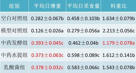 攻毒大腸桿菌后,模型對照組平均日增重、平均日采食量與對照組相比顯著下降,料重比顯著升高,造模成功。各給藥組與模型組相比,顯著提高平均日增重、平均日采食量,顯著降低料重比。發(fā)酵中藥組與空白對照組相比,顯著提高平均日增重、平均日采食量,顯著降低料重比。發(fā)酵中藥組料重比顯著抵于中藥水提組和乳酸菌組差異。中藥發(fā)酵組對仔豬生長性能有較好的促進(jìn)作用,能顯著提高平均日增重、平均日采食量,降低料重比,效果最優(yōu)。