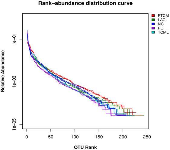 模型PC組盲腸內(nèi)微生物的OTU等級曲線坡度最大且橫坐標(biāo)范圍最小。FTCM(中藥發(fā)酵組)等級曲線最平穩(wěn)且橫坐標(biāo)范圍最大,說明仔豬盲腸中微生物物種分布較均勻,其次是LAC組和TCML組。說明,給藥后,仔豬盲腸中微生物物種增多且分布均勻。