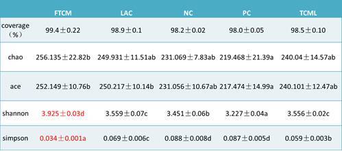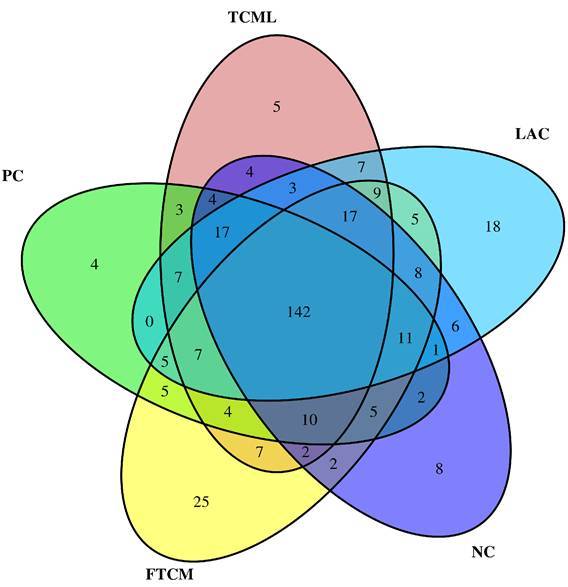OTU(operationaltaxonomic units),即操作分類單元。即相似性聚類分析,用以表現(xiàn)菌群豐度。試驗共獲得353 個不同OTU,其中五組樣品共有的OTU數(shù)是142個;TCML組中共有 248 個OUT,5個特有OUT;LAC組中共有263 個OTU,18個特有OUT;NC組中共有242個OTU,8個特有OUT;FTCM組中共有264個OUT,25個特有OTU。說明仔豬飼喂中藥發(fā)酵物后,特異性O(shè)UT數(shù)量增加,菌群種類豐富。