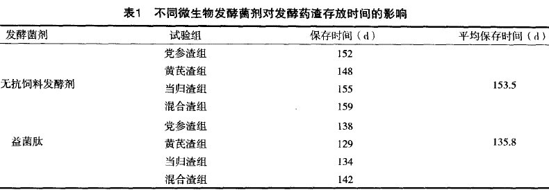通過(guò)對(duì)兩種生物發(fā)酵菌劑發(fā)酵中草藥藥渣8個(gè)樣本試驗(yàn)保存時(shí)間的觀測(cè),結(jié)果為無(wú)抗飼料發(fā)酵劑發(fā)酵的藥渣保存時(shí)間較長(zhǎng),平均保存時(shí)問(wèn)較益菌肽發(fā)酵時(shí)間長(zhǎng)17d。說(shuō)明用“99全能飼料發(fā)酵劑”發(fā)酵藥渣飼料可取得更好的效果。