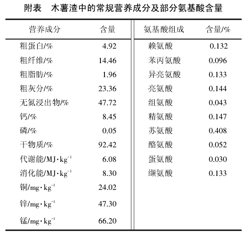 木薯經過加工生產成為淀粉和酒精后所剩下來的下腳料混合物稱為木薯渣。木薯渣粗纖維含量高,碳水化合物含量高,微量元素、礦物質和氨基酸含量豐富,但蛋白質含量低,是一種來源廣泛、價格低廉的能量飼料。胡忠澤等采用常規(guī)分析和原子吸收分光光度計等現(xiàn)代化先進儀器相結合,對木薯渣的營養(yǎng)價值進行分析,分析結果見附表。吳世林等對木薯渣中部分氨基酸成分(以干物質為基礎)進行分析,結果見附表。