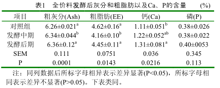 2.3發(fā)酵前后全價料灰分和粗脂肪以及Ca、P的變化由表1可知,全價飼料發(fā)酵后,與對照組相比,發(fā)酵中期的粗灰分和粗脂肪含量顯著升高(P<0.05),鈣和磷的含量有上升趨勢,差異不顯著;發(fā)酵后期的粗灰分、粗脂肪和磷含量有升高趨勢,但差異不顯著,鈣含量顯著高于對照組(P<0.05)。發(fā)酵后期的粗灰分和粗脂肪含量顯著高于發(fā)酵中期(P<0.05),與發(fā)酵中期相比,發(fā)酵后期鈣和磷含量有上升趨勢,但差異不顯著。