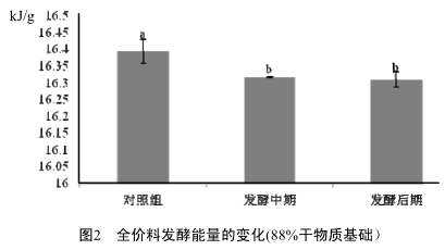 2.2發(fā)酵前后全價料能量的變化全價飼料經(jīng)乳酸菌和酵母菌發(fā)酵后,能量顯著降低(如圖2),發(fā)酵中期和發(fā)酵后期能量顯著低于對照組(P<0.01),發(fā)酵后期有比發(fā)酵中期降低的趨勢,但差異不顯著。