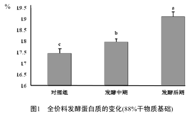 2.1發(fā)酵前后全價配合飼料粗蛋白的變化接種乳酸菌和酵母菌發(fā)酵全價料,粗蛋白的變化結(jié)果如圖1所示,從圖中可知,在相同干物質(zhì)基礎(chǔ)(88%),全價料經(jīng)乳酸菌和酵母菌發(fā)酵后,粗蛋白的含量顯著高于對照組(P<0.05),且發(fā)酵后期顯著高于發(fā)酵中期(P<0.05)。