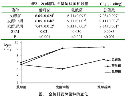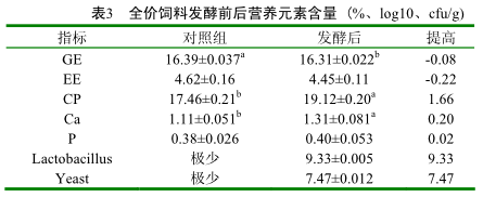 全價配合飼料發(fā)酵前后營養(yǎng)物質(zhì)變化分析,增加了全價飼料中的粗蛋白、鈣、磷的相對含量,降低了粗脂肪和能量的相對含量,增加了乳酸菌和酵母菌的含量