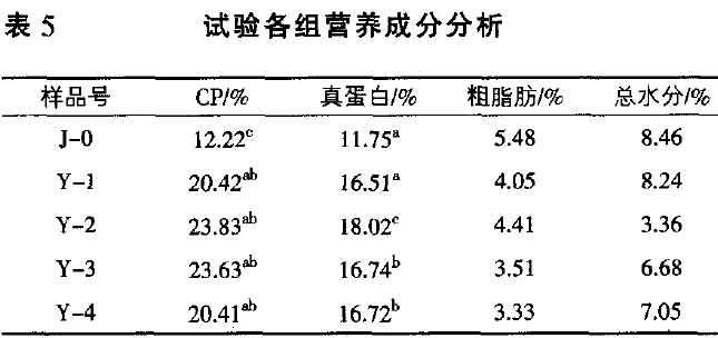 結果見表5。添加尿素后,飼料粗蛋白提高較多,經過發(fā)酵,真蛋白提高了約5個百分點。比較發(fā)酵前后可知,白酒糟在發(fā)酵后的粗蛋白水平比發(fā)酵前有顯著提高(P<0.05),真蛋白水平也有顯著提高(P<0.05),且真蛋白比率都在71%以上,達到了預期效果,發(fā)酵取得成功。