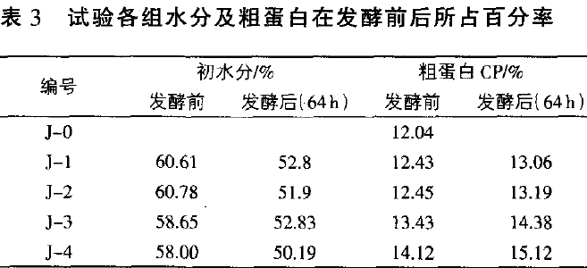結果見表3。發(fā)酵后水分比發(fā)酵前平均下降約7個百分點,水分經發(fā)酵后有所下降;發(fā)酵后粗蛋白(CP)比發(fā)酵前平均提高約1個百分點,粗蛋白經發(fā)酵后有所提高,但效果不明顯。結合顯微鏡觀察來看,致使發(fā)酵效果不明顯的最重要因素為氮源不足,可把尿素添加量從1.5%