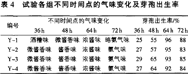 在發(fā)酵后36h,各組酒糟顏色變深,芽孢生成率為20%左右;在發(fā)酵后48h,開始有微醬香味,但伴有氨氣味,芽孢生成率為45%~50%,菌體瘦小,發(fā)育不良:在發(fā)酵后64h,醬香味中氨氣味更為濃重,涂片檢查,芽孢生成率在90%一94%,但菌體依然瘦小,發(fā)育不良:發(fā)酵后72 h,氨氣味比醬香味濃,涂片觀察,芽孢生成率在82%左右,趨于退化。