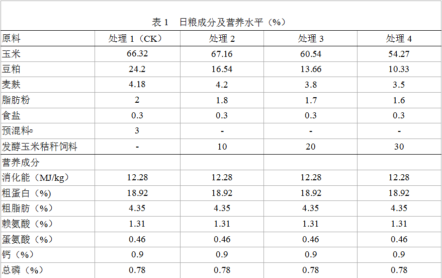 1.2.2  玉米秸稈發(fā)酵處理方法  首先把收獲的玉米干秸稈用粉碎機粉碎后過40目篩,然后在玉米秸稈粉上均勻潑上經(jīng)激活的菌液(具體投料按重量計算有玉米秸稈粉:玉米粉:活性菌粉為500公斤:10公斤:0.25公斤),用耙撈勻。其次,使撈勻的菌玉米秸稈粉在好氧情況下發(fā)酵2小時,再裝袋,每裝30cm厚時在玉米秸稈粉表面均勻噴上菌液,最后密封好厭氧發(fā)酵7天即可。