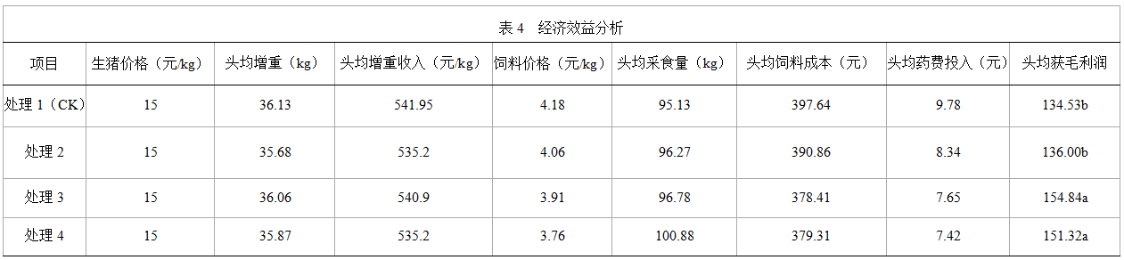 由表4可知,處理2、3、4與處理1(CK)的毛利潤分別是136元、154.84元、151.32元和134.53元每頭,其中處理2的毛利潤比處理1(CK)提高1.09%,差異不顯著(P>0.05);處理3、4的毛利潤比處理1(CK)分別提高15.1%、10.36%,差異顯著(P<0.05)。由此可見,微生物發(fā)酵玉米秸稈飼料飼喂生長育肥豬,添加量在20%~30%時,可以降低養(yǎng)殖成本,提高成活率和經(jīng)濟效益,且以添加20%的量效果最佳。
