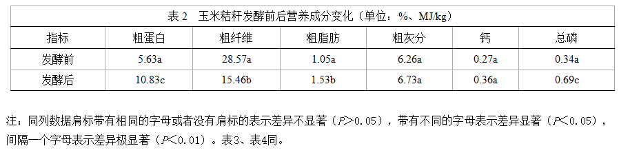 由表2可見,玉米秸稈發(fā)酵前后相比較,有的營養(yǎng)成分提高,有的則降低,其中營養(yǎng)成分提高的有:粗蛋白含量提高92.36%,前后相比較差異極顯著(P<0.01),粗脂肪提高45.71%,前后相比較差異顯著(P<0.05),粗灰分提高7.51%,前后相比較差異不顯著(P>0.05),鈣提高33.33%,前后相比較差異不顯著(P>0.05),總磷提高102.94%,前后相比較差異極顯著(P<0.01);營養(yǎng)成分降低的有:粗纖維降低45.89%,前后相比較差異顯著(P<0.05)。