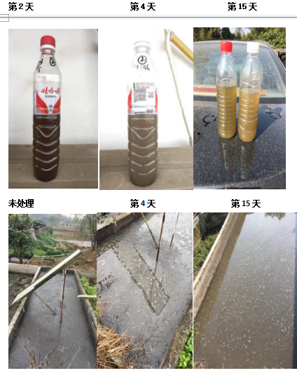 該場(chǎng)處理泡糞量為30立方,原先池內(nèi)惡臭粘稠結(jié)塊的黑色水泡糞,在使用使用畜禽流體發(fā)酵劑處理第2天可發(fā)現(xiàn)該池液體水樣呈現(xiàn)紅褐色,臭味消失殆盡,第4天的時(shí)候水體樣本開始轉(zhuǎn)變?yōu)闇\灰紅色,池內(nèi)原先粘稠的泡糞可以用木棍輕松的攪動(dòng)。處理15天后該養(yǎng)殖場(chǎng)的的水泡糞,水樣由原先的黑褐色轉(zhuǎn)為淺綠色,輕攪池底下的的泡糞可見上浮的糞便已經(jīng)被分解成如沙子般松散。