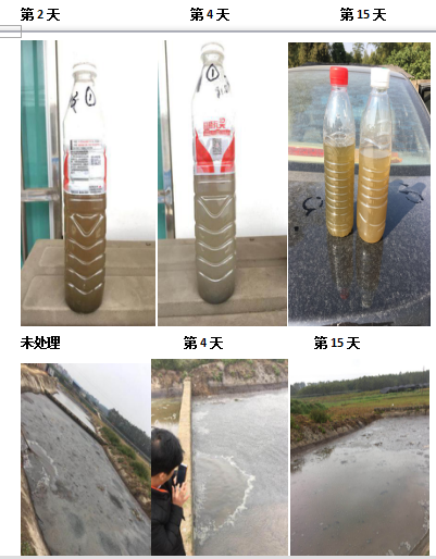 該場(chǎng)處理的泡糞量為500立方,未處理前該場(chǎng)泡糞液面有大量的上浮泡糞,使用使用畜禽流體發(fā)酵劑處理第2天可發(fā)現(xiàn)該池液體水樣呈現(xiàn)淺紅色,臭味減少大半,第4天的時(shí)候水體樣本開始抓變?yōu)闇\灰色,站在池邊已經(jīng)聞不到明顯顯現(xiàn)的臭味。處理15天后該養(yǎng)殖場(chǎng)的的水泡糞,液面的上浮泡糞已經(jīng)分解完畢,只剩下池中右上角的稻草,且液面相對(duì)純凈,泡糞池原先的臭味完全消失。
