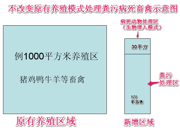 如上圖,養(yǎng)殖場不需要改變原來的養(yǎng)殖區(qū)域,只需要另外建設一個養(yǎng)殖面積五分之一的處理池即可。如上圖,1000平方米面積養(yǎng)殖區(qū)域,只需要在養(yǎng)殖區(qū)外新建一個200平方米左右配套的糞污和病死動物處理區(qū)即可,實施由廣西助農畜牧科技有限公司的專利技術——《一種畜禽場高效微生物糞便處理系統(tǒng)》專利號:ZL201220286119.68。