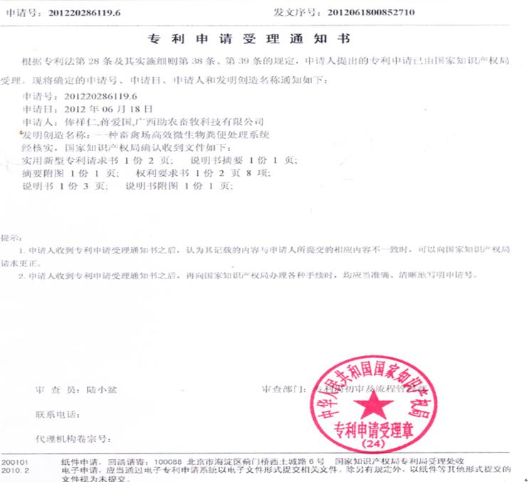 《一種畜禽場高效微生物糞便處理系統(tǒng)》專利號:ZL201220286119.68。