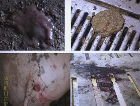 1)病豬主要表現(xiàn)出血色水樣腹瀉,隨著病程的延長,會排出黑色瀝青(柏油)樣稀糞,有時糞便中混雜著大量未消化的飼料顆粒。
