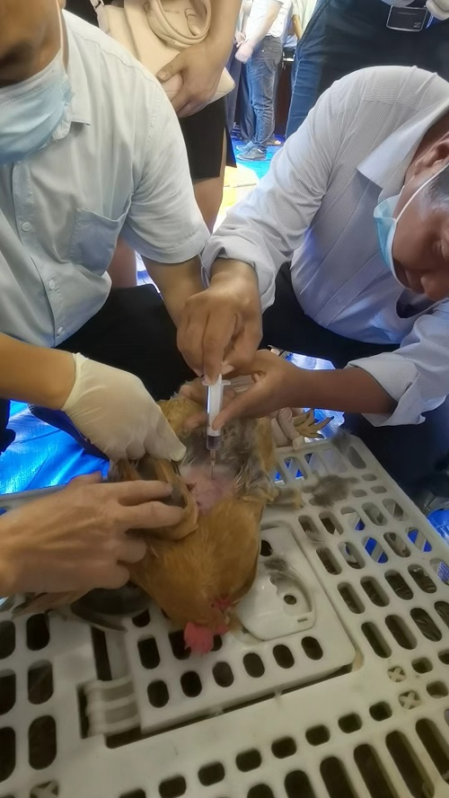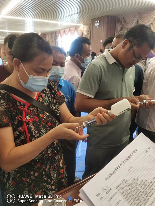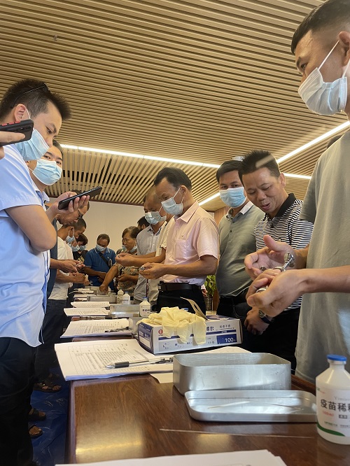 理論技術培訓完之后又對所有的村級防疫員進行了豬、雞、羊的采血實操培訓。先是由培訓老師進行詳細的理論講解和注意事項后進行了一次現(xiàn)場演示,再由各村級防疫員逐一進行了實際操作。接著由獸醫(yī)社會化服務承包方--廣西助農(nóng)的技術員對各村級防疫員進行了現(xiàn)場實操技能考核。
