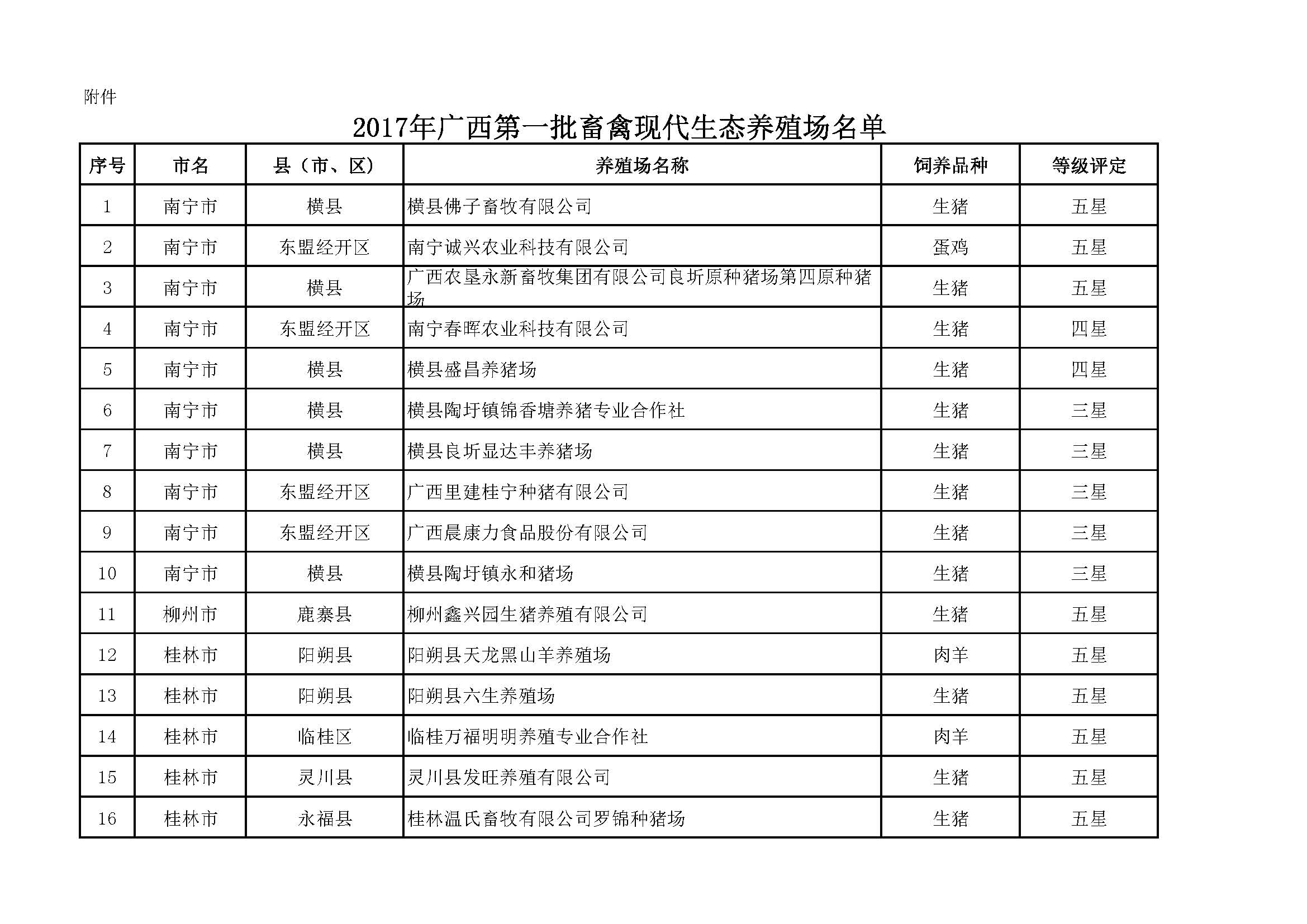 附件: 2017年第一批廣西畜禽現(xiàn)代生態(tài)養(yǎng)殖場(chǎng)名單