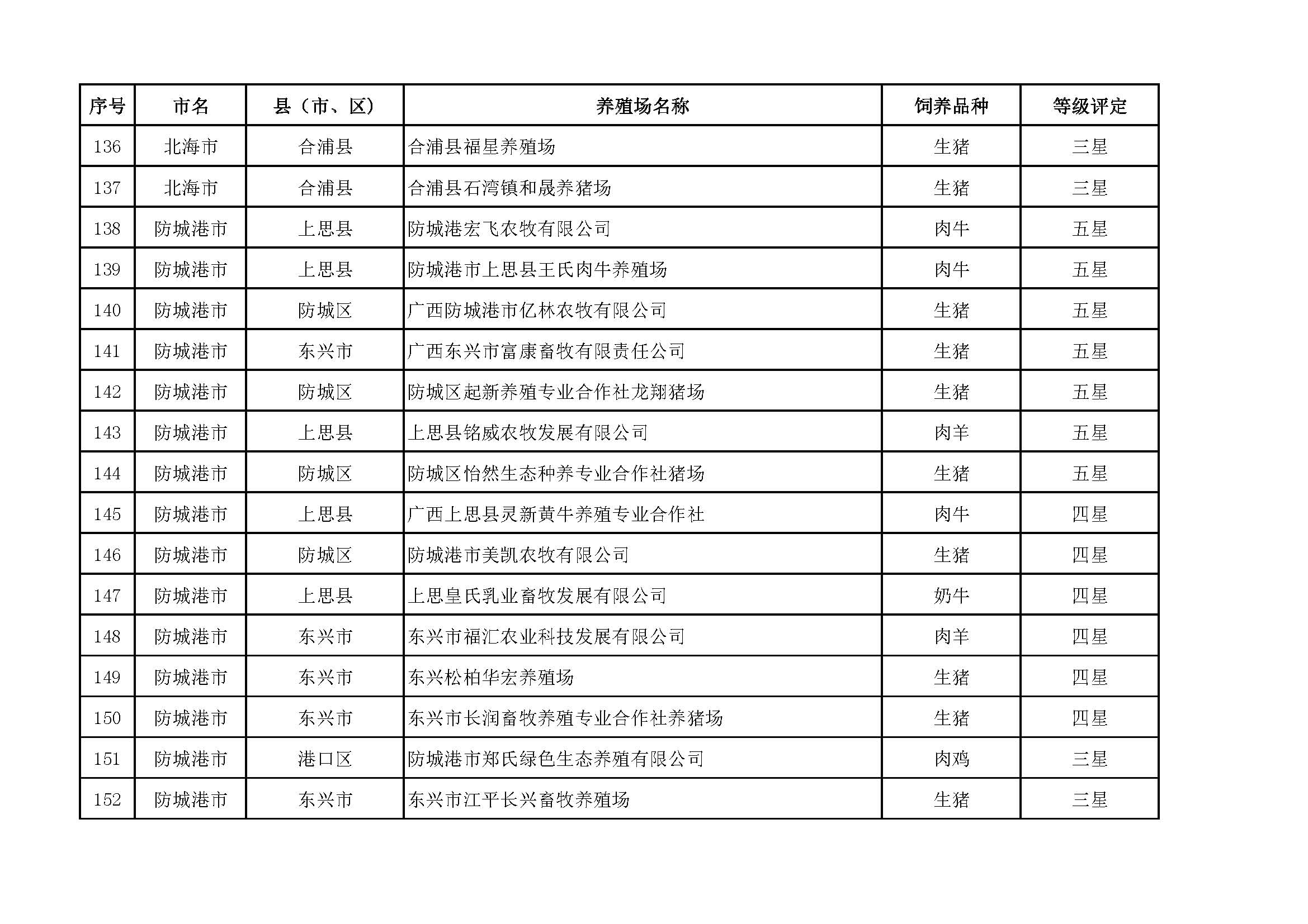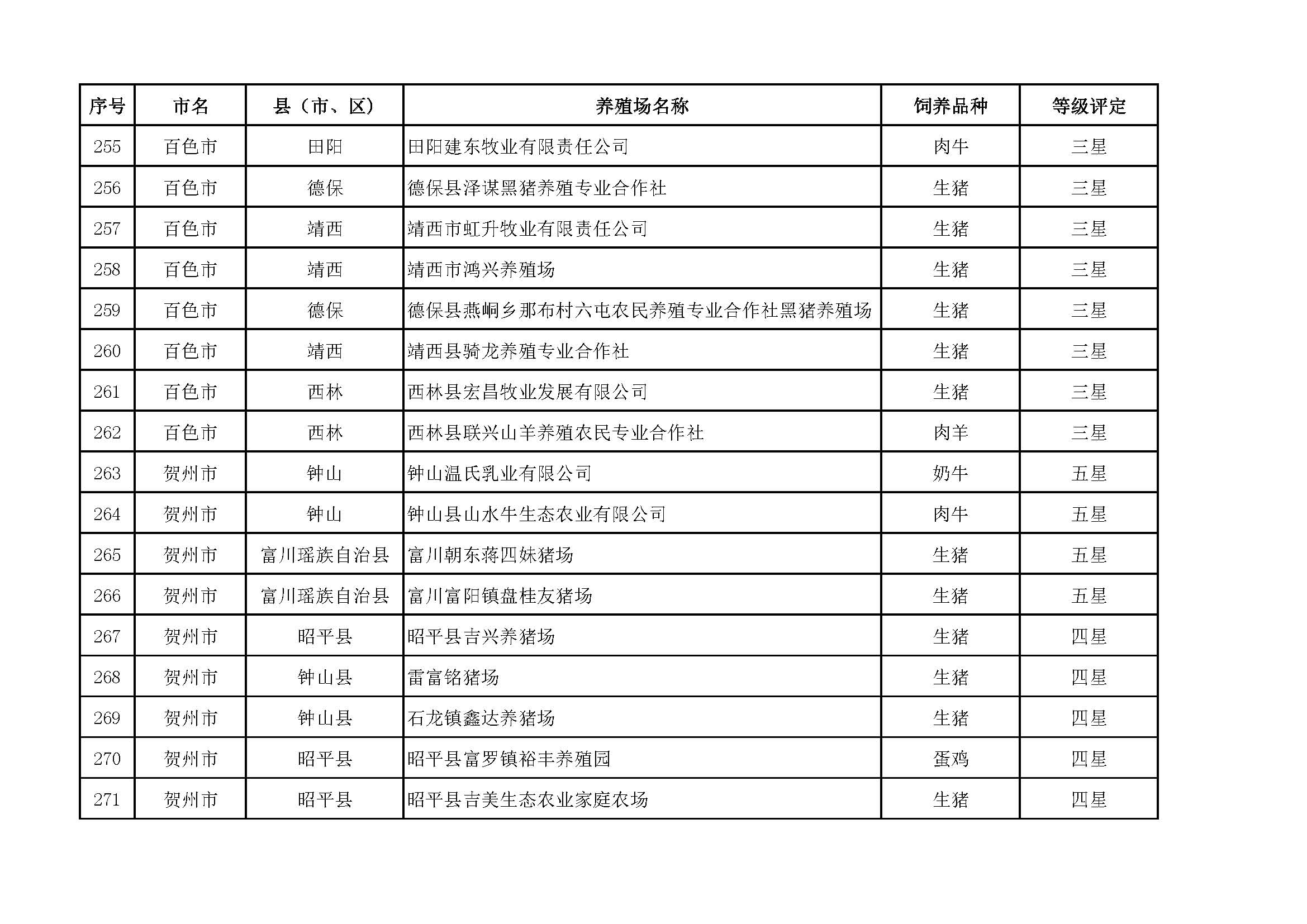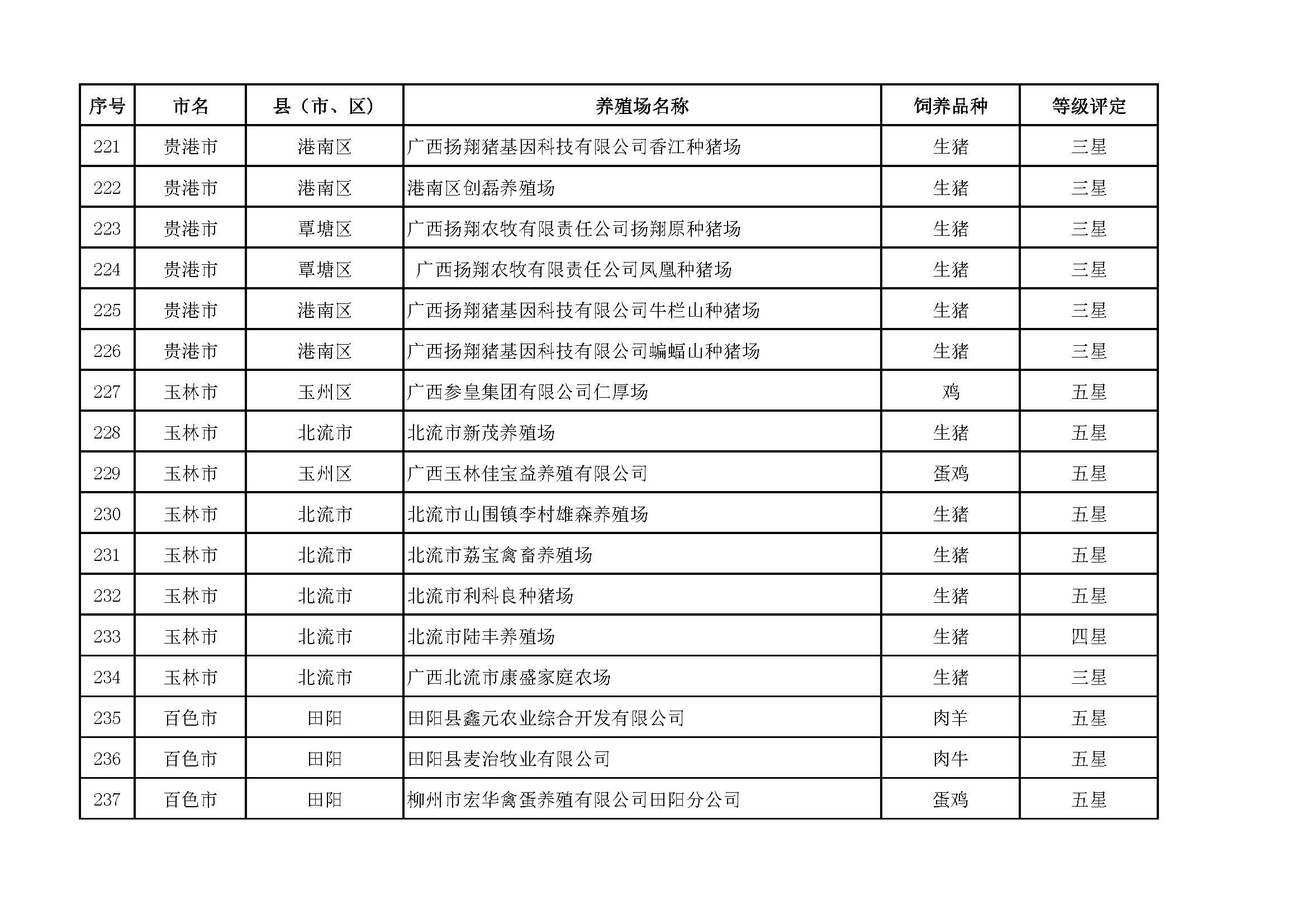 根據(jù)《廣西畜禽現(xiàn)代生態(tài)養(yǎng)殖場(chǎng)認(rèn)證工作方案(2017-2020)》(桂漁牧發(fā)〔2017〕16號(hào))精神,我局采取、市、自治區(qū)三級(jí)專家核驗(yàn)的方式組織開(kāi)展了2017年第一批廣西畜禽現(xiàn)代生態(tài)養(yǎng)殖場(chǎng)認(rèn)證工作。經(jīng)現(xiàn)場(chǎng)核驗(yàn)、網(wǎng)上公示,決定授予橫縣佛子畜牧有限公司等417家養(yǎng)殖場(chǎng)“廣西畜禽現(xiàn)代生態(tài)養(yǎng)殖場(chǎng)”稱號(hào),其中五星級(jí)58家、四星級(jí)136家、三星級(jí)223家,現(xiàn)將名單予以公布。有效期5年(自發(fā)文之日起至2021年12月31日止)。獲得 “四星級(jí)”或“三星級(jí)”稱號(hào)的養(yǎng)殖場(chǎng),經(jīng)過(guò)整改提高,自評(píng)達(dá)到上一星級(jí)標(biāo)準(zhǔn)的,可以按程序申請(qǐng)升級(jí)。