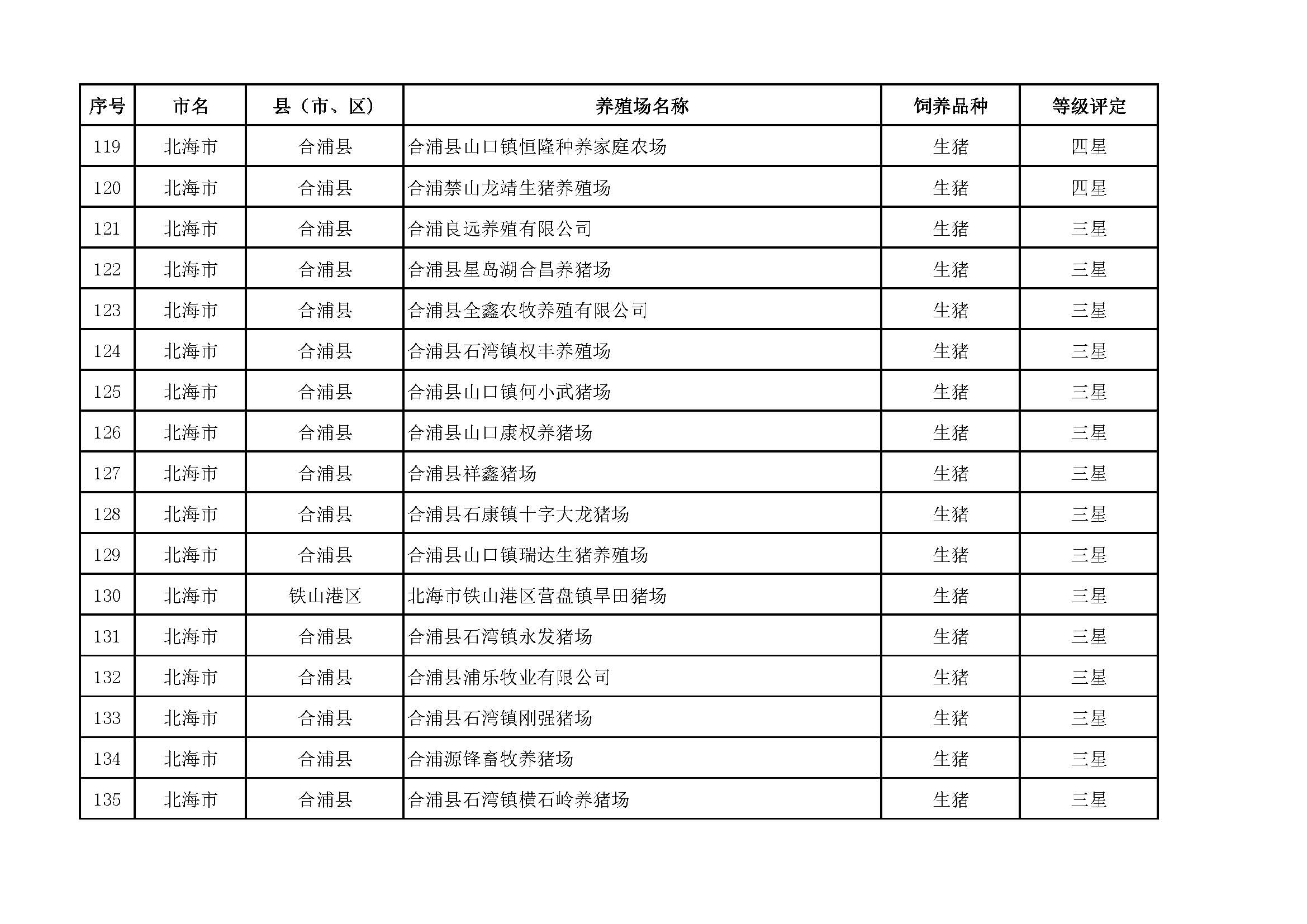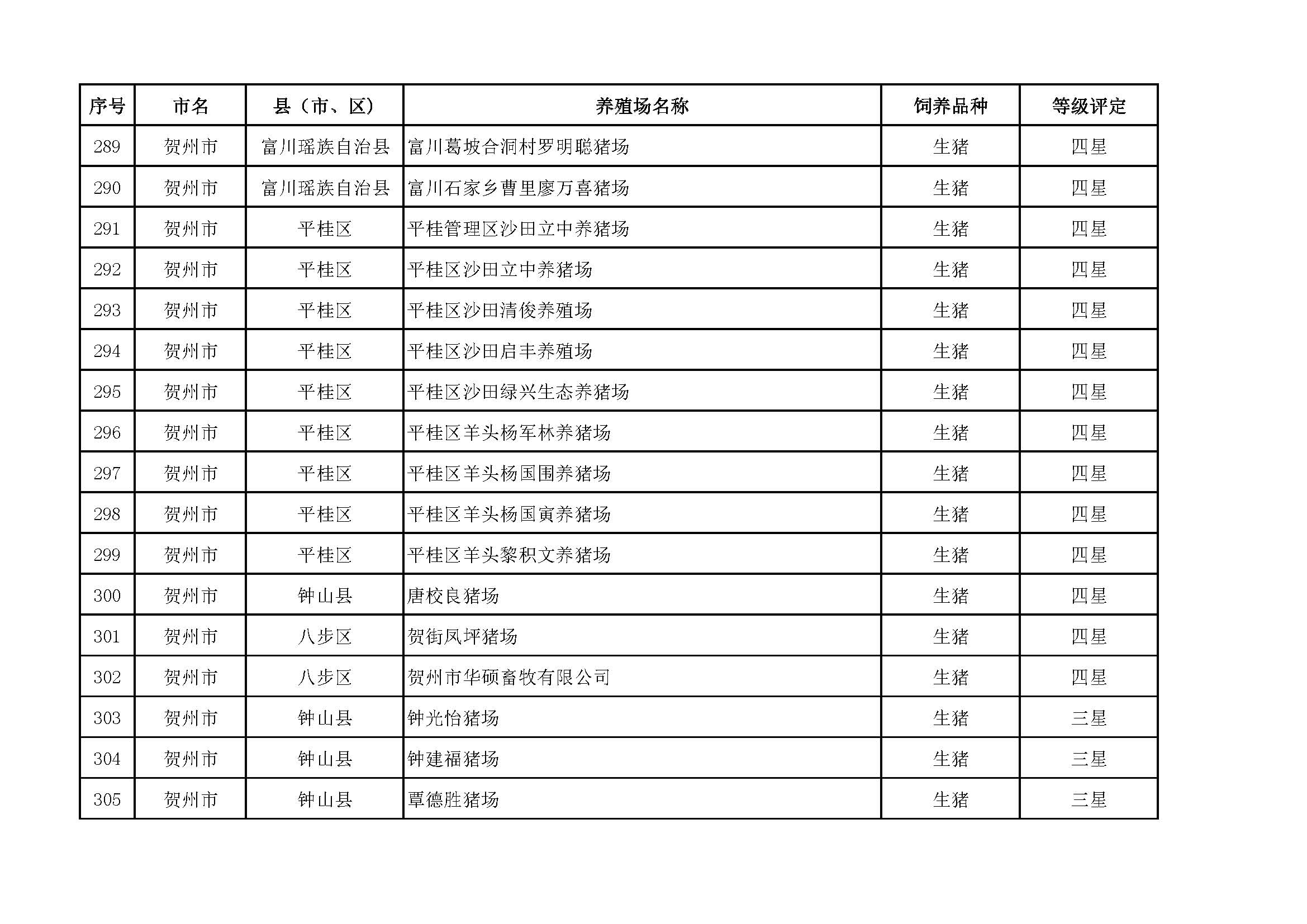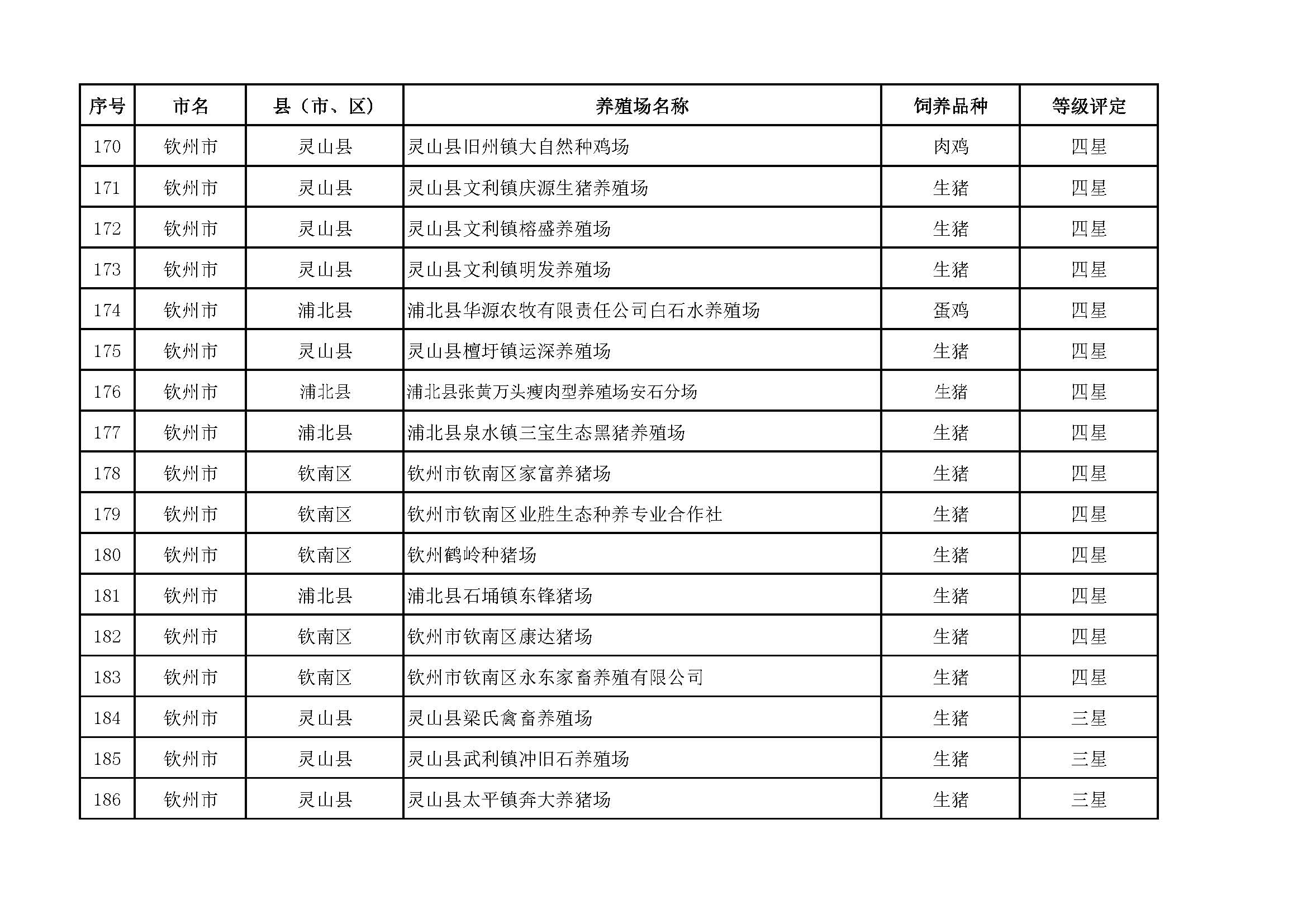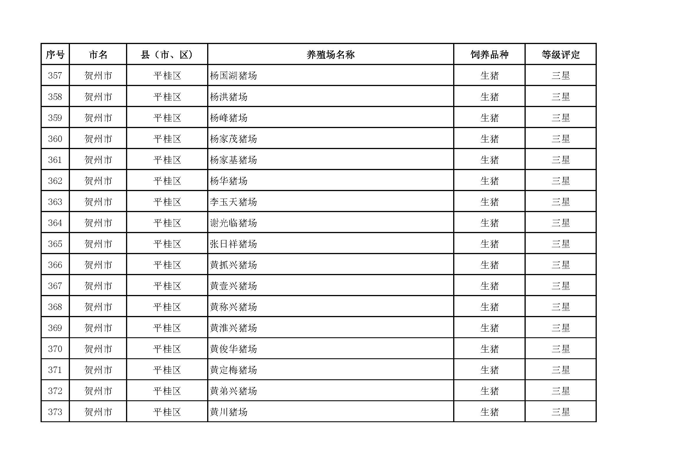 根據(jù)《廣西畜禽現(xiàn)代生態(tài)養(yǎng)殖場(chǎng)認(rèn)證工作方案(2017-2020)》(桂漁牧發(fā)〔2017〕16號(hào))精神,我局采取、市、自治區(qū)三級(jí)專家核驗(yàn)的方式組織開(kāi)展了2017年第一批廣西畜禽現(xiàn)代生態(tài)養(yǎng)殖場(chǎng)認(rèn)證工作。經(jīng)現(xiàn)場(chǎng)核驗(yàn)、網(wǎng)上公示,決定授予橫縣佛子畜牧有限公司等417家養(yǎng)殖場(chǎng)“廣西畜禽現(xiàn)代生態(tài)養(yǎng)殖場(chǎng)”稱號(hào),其中五星級(jí)58家、四星級(jí)136家、三星級(jí)223家,現(xiàn)將名單予以公布。有效期5年(自發(fā)文之日起至2021年12月31日止)。獲得 “四星級(jí)”或“三星級(jí)”稱號(hào)的養(yǎng)殖場(chǎng),經(jīng)過(guò)整改提高,自評(píng)達(dá)到上一星級(jí)標(biāo)準(zhǔn)的,可以按程序申請(qǐng)升級(jí)。