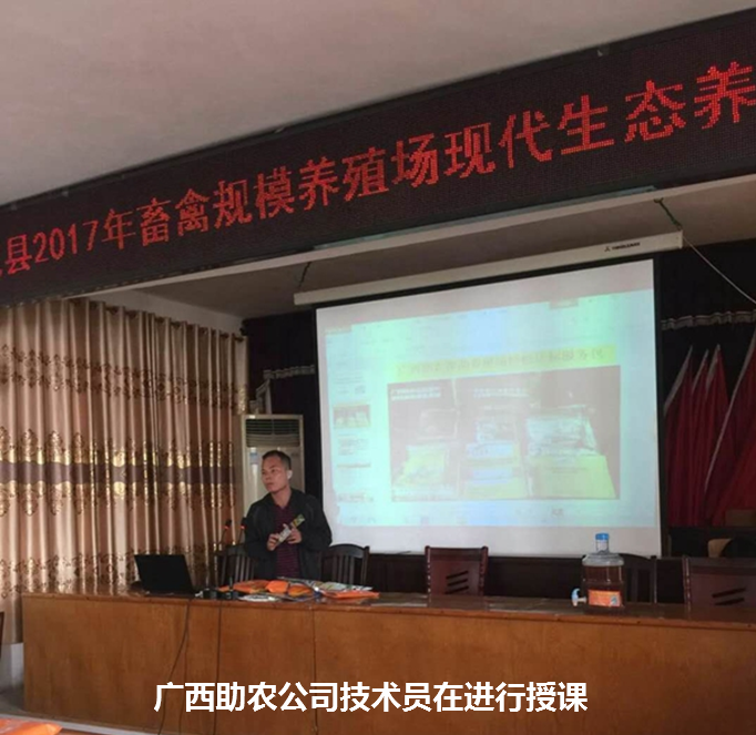 來賓市忻城縣舉辦2017年農(nóng)業(yè)技術(shù)推廣生態(tài)養(yǎng)殖技術(shù)培訓(xùn)班,特別邀請廣西助農(nóng)公司技術(shù)員講解益生菌的正確使用