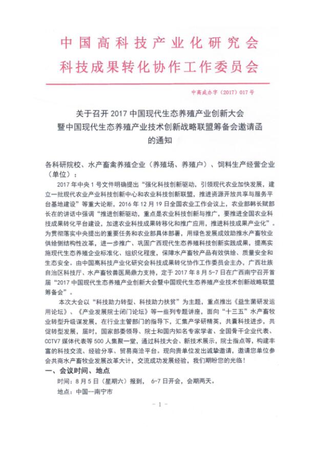 關(guān)于召開2017中國現(xiàn)代生態(tài)養(yǎng)殖產(chǎn)業(yè)創(chuàng)新大會暨中國現(xiàn)代生態(tài)養(yǎng)殖產(chǎn)業(yè)技術(shù)創(chuàng)新戰(zhàn)略聯(lián)盟籌備會邀請函的通知