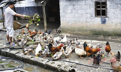 天峨訊 9月27日,天峨縣坡結(jié)鄉(xiāng)納構(gòu)村盤茶屯農(nóng)民韓運(yùn)國正在給養(yǎng)殖場的雞喂青飼料(見上圖)。