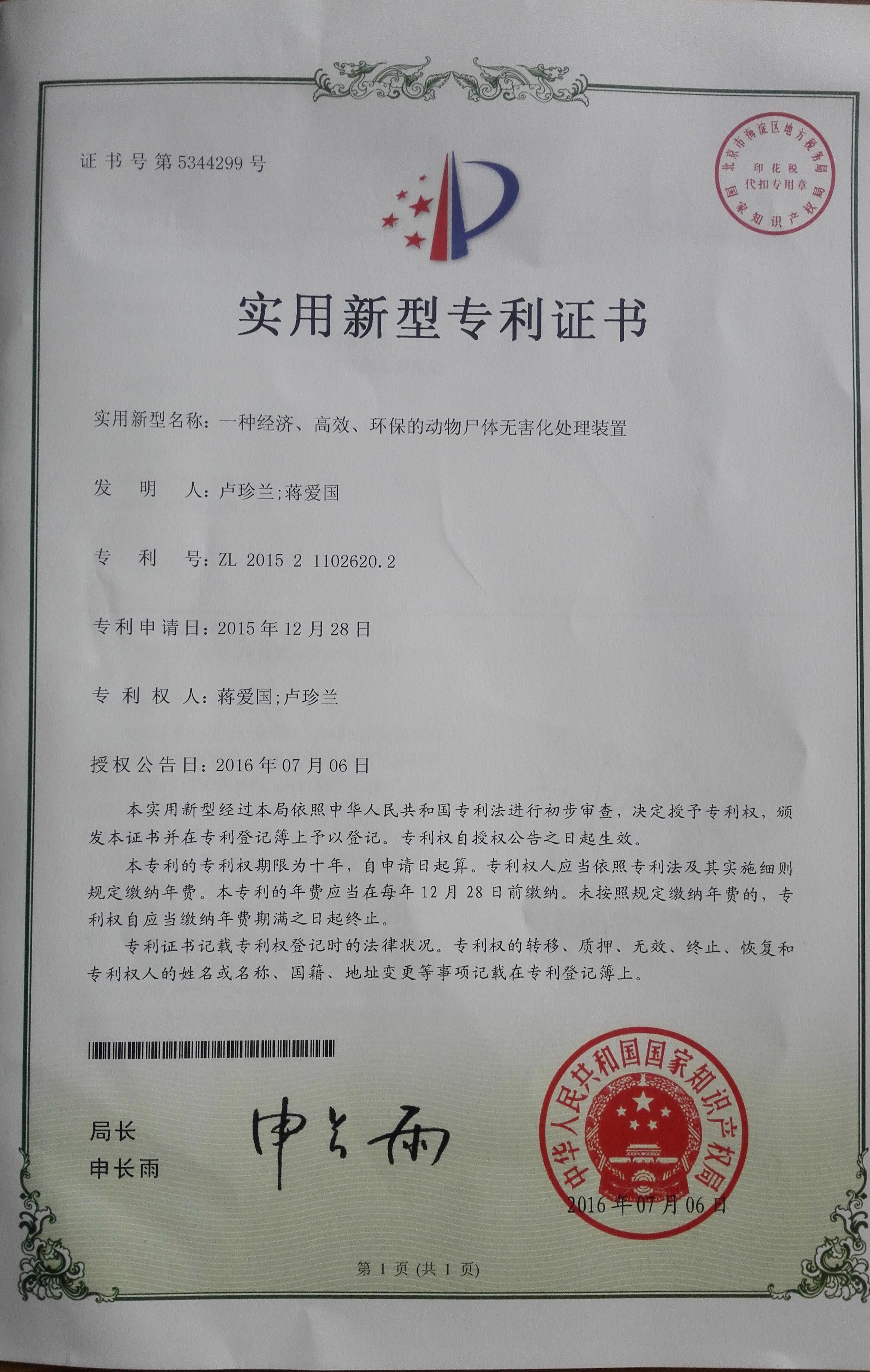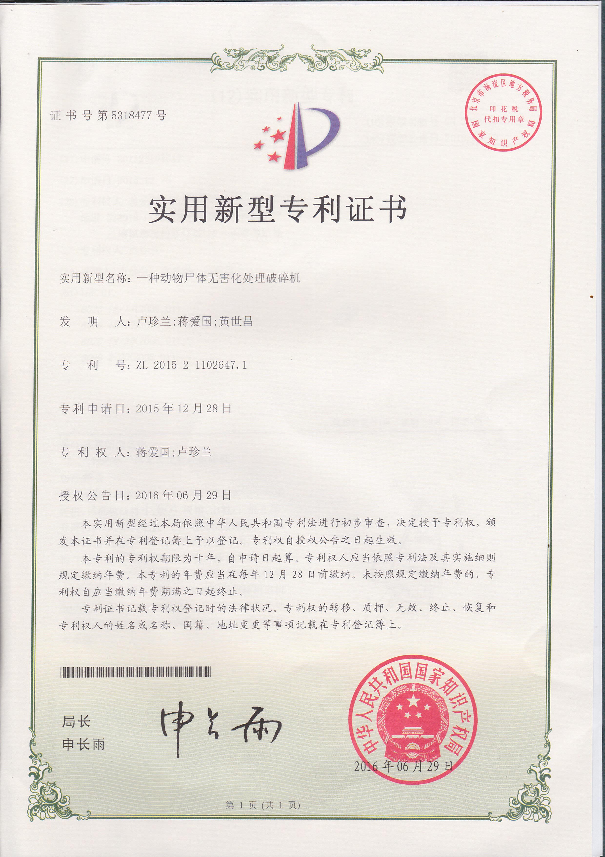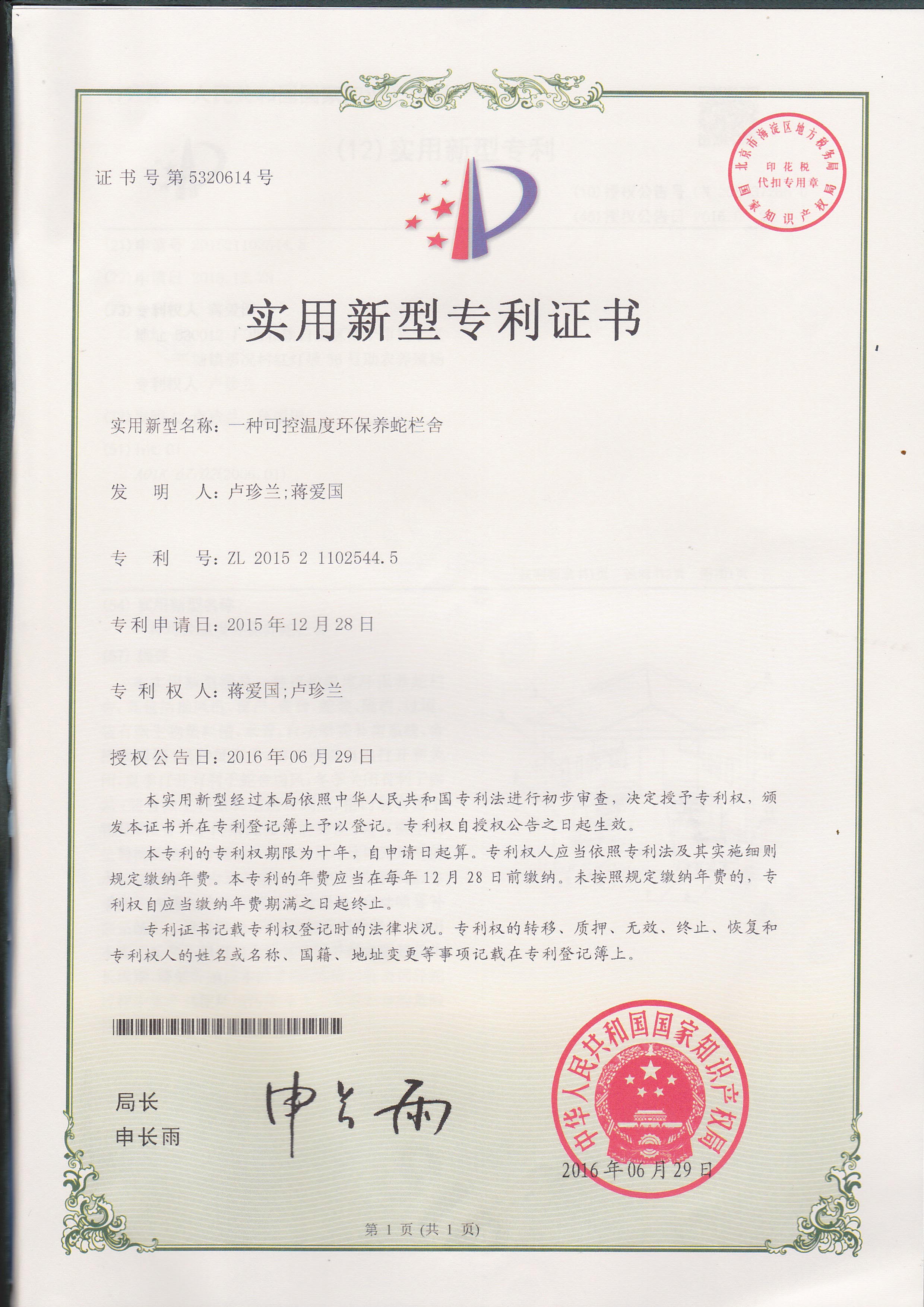近日,廣西助農(nóng)畜牧科技有限公司又獲得三項(xiàng)實(shí)用新型專利,并都取得國家知識(shí)產(chǎn)權(quán)局頒發(fā)的實(shí)用新型專利證書,實(shí)用新型名稱和專利號(hào)分別為:一種可控溫度環(huán)保養(yǎng)蛇欄舍(ZL201521102544.5)、一種動(dòng)物尸體無害化處理破碎機(jī)(ZL201521102647.1)、一種經(jīng)濟(jì)、高效、環(huán)保的動(dòng)物尸體無害化處理裝置(ZL201521102620.2),專利權(quán)限期為10年。
