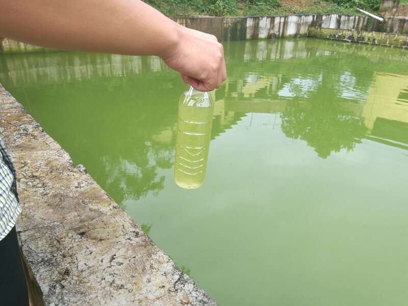 即:飼料中長期添加益生菌、定期用強效除臭降污活菌劑對圈舍以及高架床下進行噴灑,解決的圈舍及廠區(qū)的氨臭味問題,并長期在沼氣池入口和出口滴入養(yǎng)殖場污水生物處理劑,半個月后黑臭水體變成了無臭味的綠色水體!