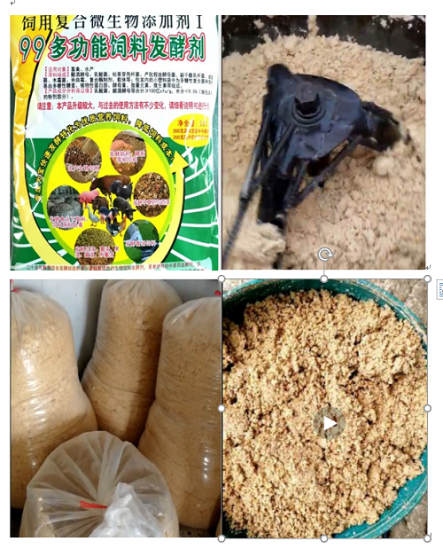 將99多功能發(fā)酵劑1-2包(500-1000克),加10%-50%玉米粉、豆粕(根據(jù)客戶(hù)需求玉米粉比例不同分普通級(jí)、中級(jí)、高級(jí)(混合其他營(yíng)養(yǎng)成分)、食鹽1公斤,1噸粉碎好的木薯渣、豆渣腐竹渣、果渣、甘蔗、胡蘿卜、南瓜、桑葉、牧草等青飼料,用米糠把含水量調(diào)制成50%-60%,簡(jiǎn)單混合均勻,放入塑料袋等進(jìn)行密封發(fā)酵,7天發(fā)酵感覺(jué)到甜酒香味愈來(lái)愈濃郁即可飼喂。每次打開(kāi)都要再次密封。