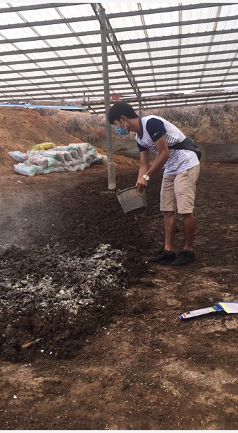 9月11日,助農(nóng)公司的技術(shù)員蔣恒輝親自與龐總操作(有圖有真相)9月18號已經(jīng)非常好的完成了雞糞發(fā)酵,包裝好就賣了。一堆大約2-3立方,正好用了一包雞糞發(fā)酵劑,(1包雞糞發(fā)酵床只需10元)2.5公斤玉米粉混合均勻撒入,開始由平鋪的雞糞,一層層撒上去,然后用鏟一層層往中間開始打堆,然后簡單覆蓋,發(fā)酵24小時,升溫高達70度左右,再過12小時,請龐總自己安排員工翻堆,并且在翻堆的時候,噴灑了半包的激活液。再簡單覆蓋,本身最好發(fā)效時間為十天,結(jié)果龐總只用了正好一周的時間,雞糞已經(jīng)發(fā)酵完成,并且效果非常好。