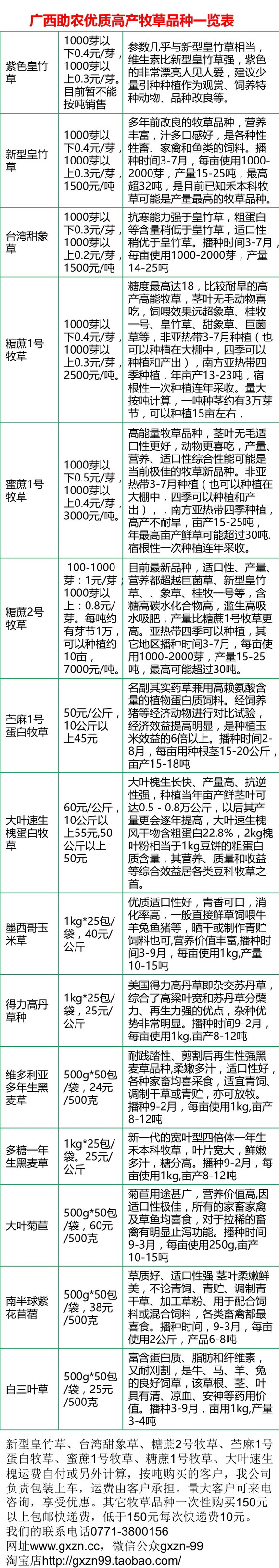 正確選擇優(yōu)良的牧草品種是關(guān)系到今后常年的效益,能夠?yàn)榭蛻?hù)提供育種資質(zhì)和新牧草品種、對(duì)大客戶(hù)能夠開(kāi)具發(fā)票(以下報(bào)價(jià)不含稅)、能夠給客戶(hù)提供種植與利用、配套設(shè)備、配套營(yíng)養(yǎng)添加劑、發(fā)酵劑等,廣西助農(nóng)公司是國(guó)內(nèi)為數(shù)不多的專(zhuān)業(yè)團(tuán)隊(duì)。