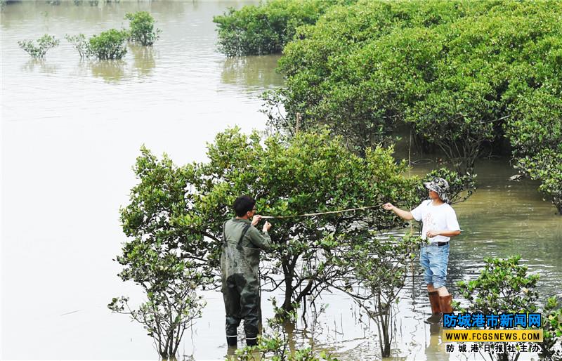 課題組調(diào)研人員在檢測紅樹林生長狀態(tài)。