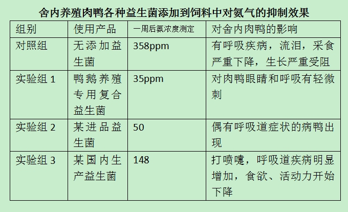 在肉鴨日糧中添加鴨鵝養(yǎng)殖專用復合益生菌結(jié)果發(fā)現(xiàn),具有提高日增重,改善飼料轉(zhuǎn)化率及降低死亡率的效果。一組試驗表明可使肉鴨增重提高14.1%,料重比下降7.6%。鴨血液球蛋白水平提高,血氨減少,鴨的抗病力增強??蓸O顯著地促進肉鴨對日糧蛋白質(zhì)的利用,可提高肉鴨早期生長速度和飼料率。