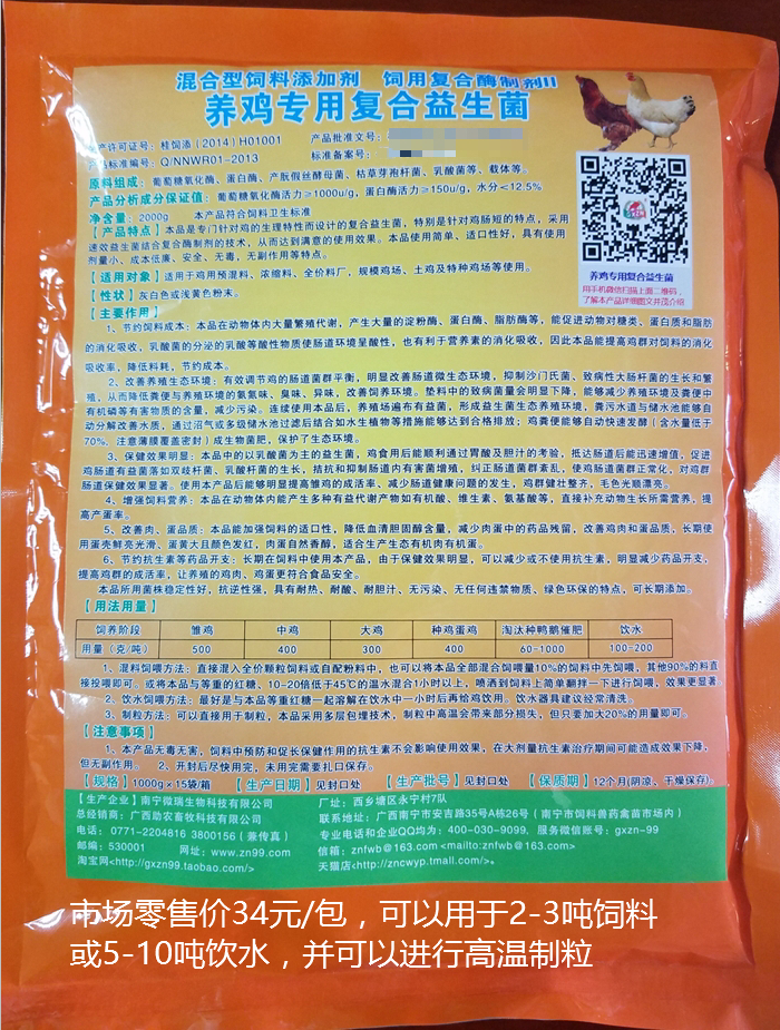 養(yǎng)雞專(zhuān)用復(fù)合益生菌采用粉劑塑料袋包裝,每包1000克能夠用于2-3噸飼料,每件15包,市場(chǎng)零售價(jià)34元/包,淘寶店購(gòu)買(mǎi)請(qǐng)點(diǎn)擊我,天貓商城購(gòu)買(mǎi)請(qǐng)點(diǎn)擊我