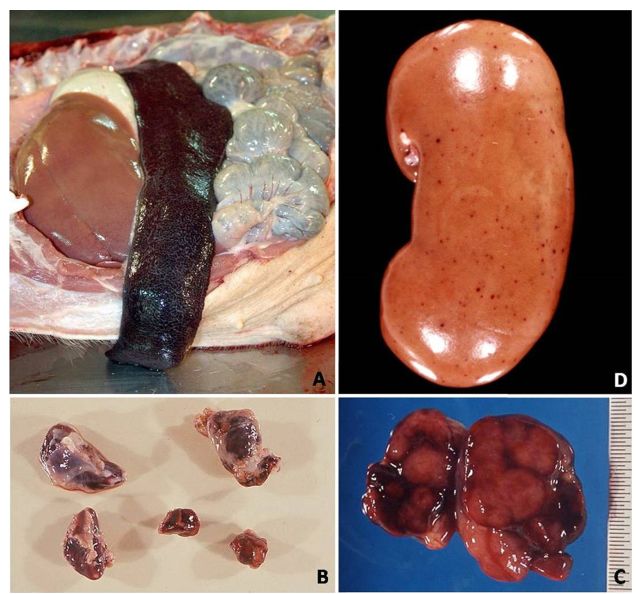 表現(xiàn)嚴(yán)重的肺水腫,同時(shí)為充血性脾腫大,可能達(dá)正常的六倍,邊緣為原型,同時(shí)易碎,呈現(xiàn)為黑紫色(圖41A);淋巴結(jié),主要是胃肝和腎淋巴結(jié)上面有出血(圖41C),呈現(xiàn)大理石花斑(圖41C);腎臟皮質(zhì)和腎盂中通常出現(xiàn)出血瘀點(diǎn)(圖41D)。其他非典型病理變化還包括膀胱、心內(nèi)膜、心外膜和胸膜有出血瘀點(diǎn)。