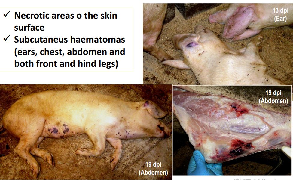 1.簡(jiǎn)單鑒別豬感染非洲豬瘟的死亡癥狀確定,發(fā)現(xiàn)有死亡的豬是以下癥狀的,說明你的豬場(chǎng)已經(jīng)是疑似感染了(見下面圖片)